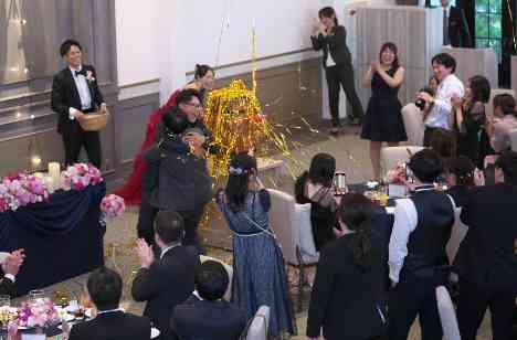 披露宴のスタートは、それぞれの出身地の魅力をぎゅっと詰め込んだ「くまモンリュック」と「いちごリュック」を背負っての入場から。会場は一気に笑顔に包まれました。 さらに、両家のゲストが一緒に楽しめる演出として、「テーブル対抗・黒ひげ危機一髪大会」を開催。剣をさす瞬間には緊張感と一体感が最高潮に達し、会場は大盛り上がりとなりました。 また、当日は熊本に住む祖父母様からのお祝いメッセージも届きました。