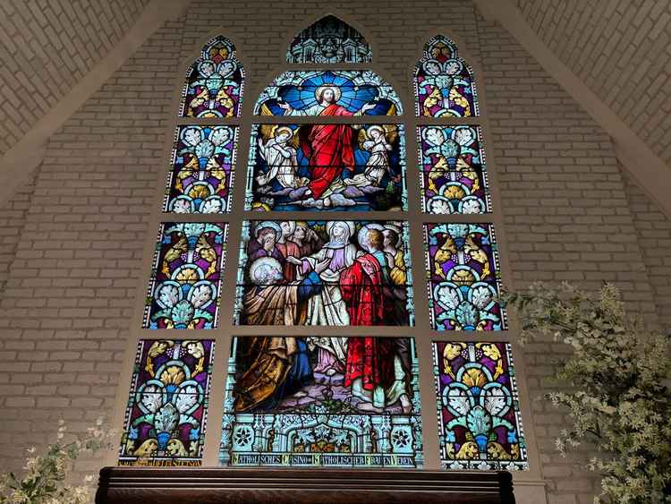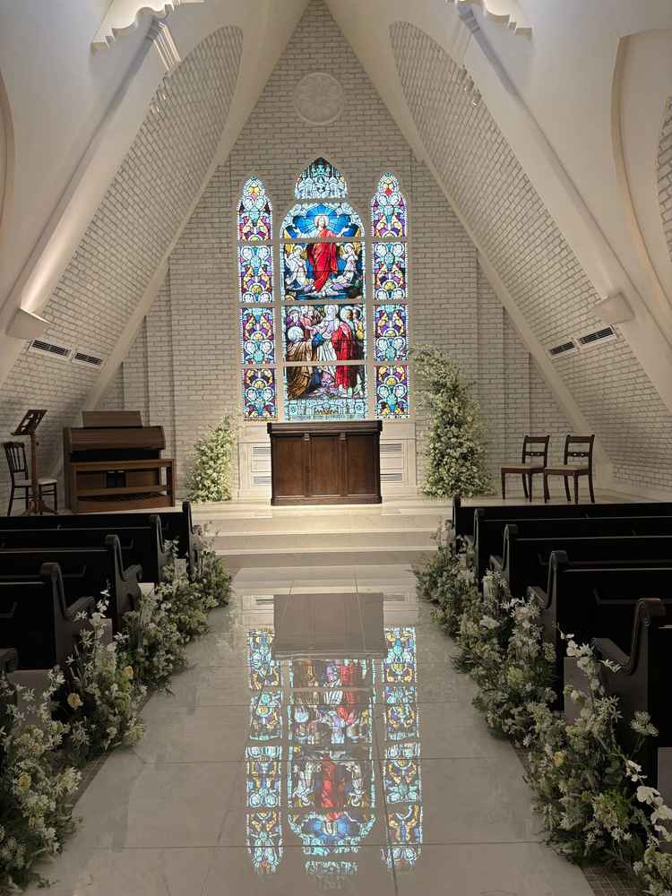 チャペルのステンドグラスが素敵で、綺麗に磨かれた床に反射されていて、特別感のあるチャペルでした。そ施設内も洋風で品が良く、雰囲気でした。