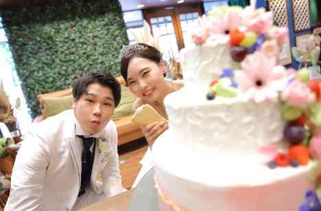 かわいい生花をあしらった3段ケーキでご入刀。大勢の方々に囲まれての入刀は笑顔一杯のシャッターチャンスになりました。 そしてファーストバイトでお互いに支えていくことを誓い合いました。 新婦から新郎へのバイトは特大サイズのクッキースプーン! 愛情の大きさがわかります! その愛情をまっすぐ受け止める新郎はクッキースプーンごとパクリ! 大盛況のケーキセレモニーになりました。