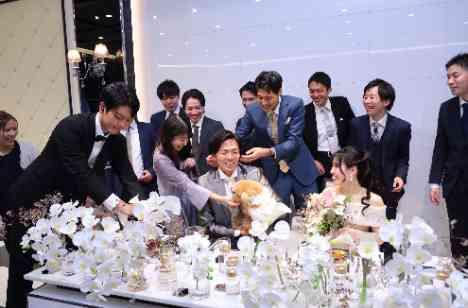 ワンちゃんも参加の披露宴は和やかな時間に。 お二人のメインテーブルにも集まりやすい雰囲気で、写真や会話をじっくり楽しめました。 ご列席者もワンちゃんとともに新郎をなでなでW 一人一人と香をを見合わせ『おめでとう』に『ありがとう』を言える雰囲気作りもお二人にとっては大事にしたかったポイントです。