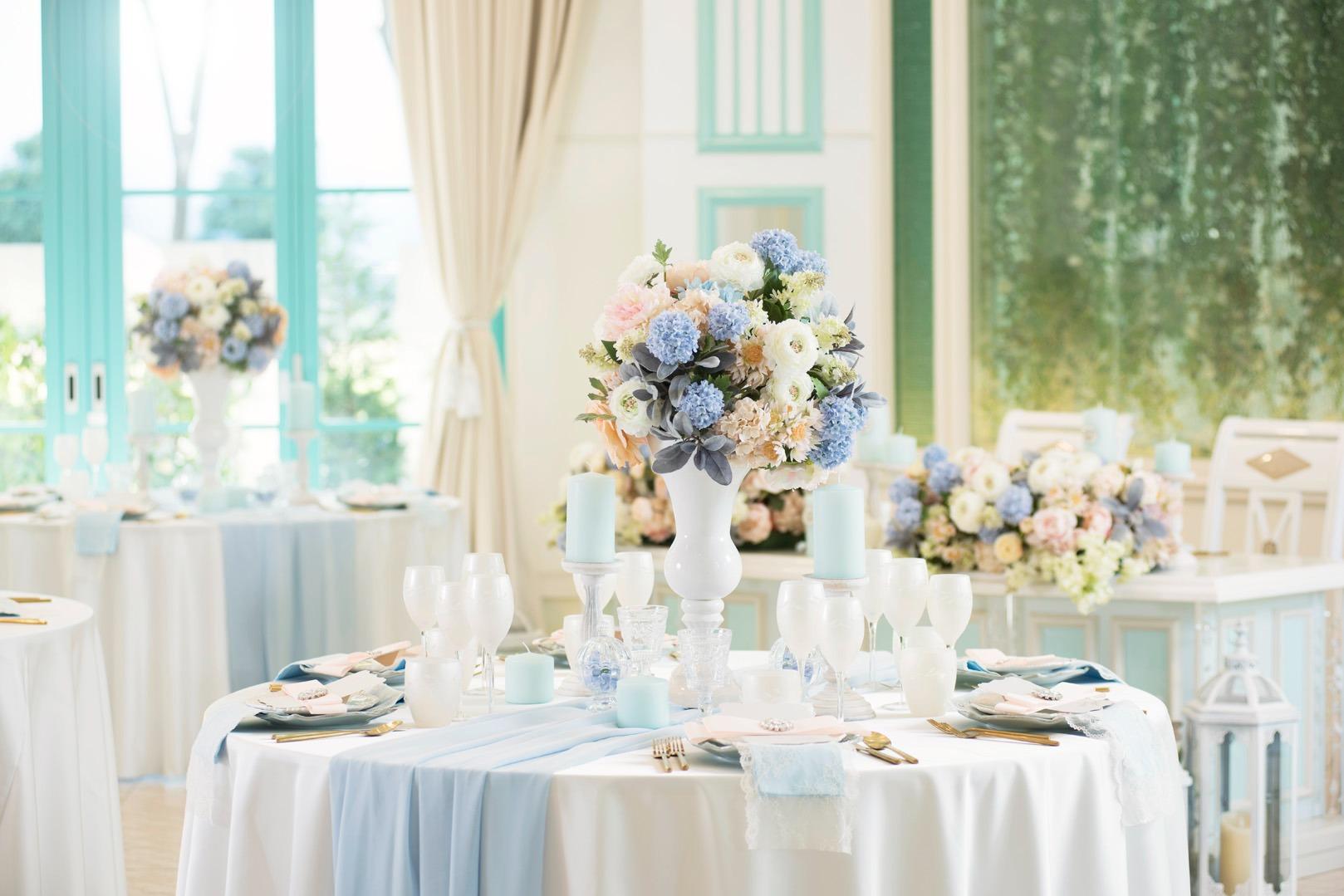 エーゲ海グリーンを基調として緑溢れる空間にお二人好みのコーディネートが自在に可能に。家族婚や親族の方だけの結婚式でも広過ぎず身近に過ごせる空間に。