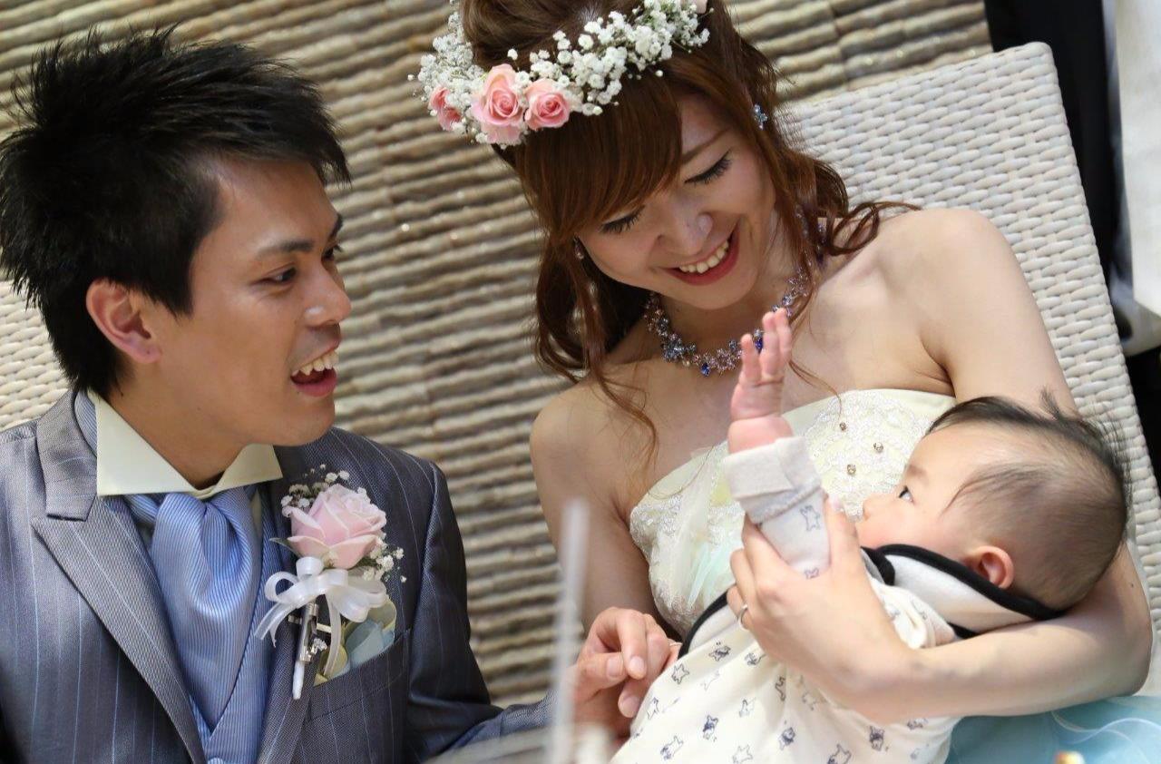 ゲストの皆さんに堅苦しい思いをさせずアットホームに披露宴をやりたかったというお二人。お庭をイメージしたホワイト×グリーンのナチュラルな会場【ジャーディン】で披露宴。ご友人のお子様を抱いているお二人もとても穏やかで優しい表情♪
