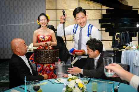 演出については自分らしさと他と被りたくないものにしたかったので、プランナーさんに相談しながら個性を詰め込みました。 ブーケトスの代わりにサングラス着用でのバズーカトスをしたり、なかなか他の人がしないであろうウェディングケーキにしたり、他とは被らない自作の席次表や席札を持参しました。 会場自体は広く、雰囲気もシックな感じで大画面に映像も映せたので、ゲストからは海の中にいるみたいだったと好評でした