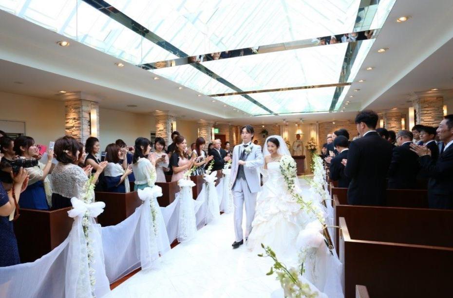ベルヴィ武蔵野の天候に左右されない全天候型室内ガーデンに魅力を感じ式場を決定されたおふたり。しかし当日はそんなふたりの心配も吹き飛ぶくらいの快晴で、まるでふたりの結婚を祝福するかのような陽光が天窓から差し込みとても明るい教会となりました。