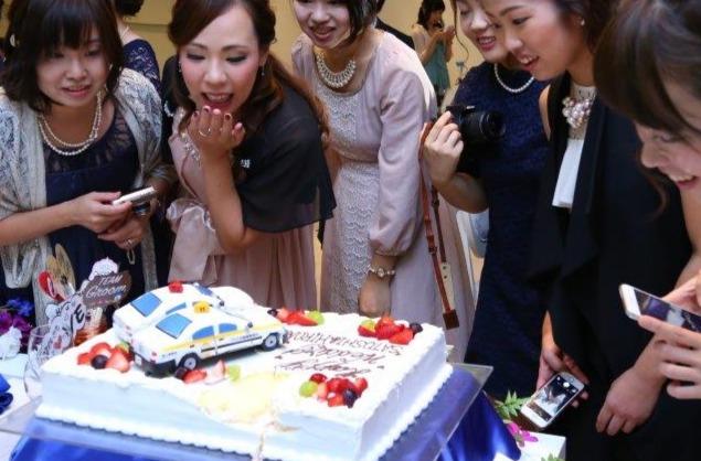 自動車学校に勤務するおふたりのこだわりは教習車の乗ったオリジナルケーキ。あまりの出来栄えにゲストもケーキの周りに集まり、「わー!よく出来てる!!すごーい!!」とう声が飛び交い写真を撮る姿もたくさん見受けられました☆