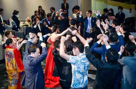 沖縄出身のご新婦様。披露宴のこだわりは沖縄同様に席の配置を行い、親御様が一番近くでお二人のことを見守っていただきました。パーティーのクライマックスでは「カチャーシー」を全員で踊りました。ご新婦様のご親族に教えて頂きながら全員で踊るカチャーシーはゲストの心を一つにすることができ、心温まるご披露宴となりました。