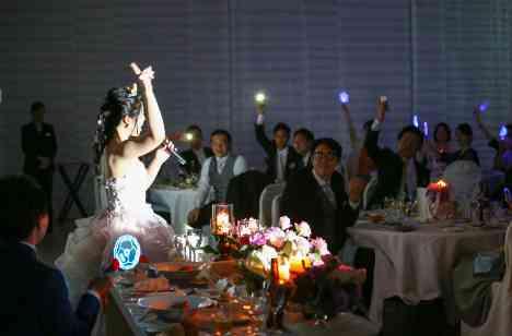 ご見学の段階から「結婚式当日は私が歌を歌ってみんなをもてなしたい」とおしゃっていたご新婦様。当日はその願い通り、ご新婦様の好きな曲を歌い、ゲストの皆様はサイリウムを振りながら、ライブ感覚の楽しい披露宴になりました♪