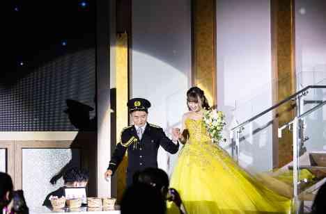 ご披露宴では様々な演出で皆様との時間を過ごされたお二人。特に盛り上がりを見せたのは、お色直し入場!カラードレスの色当てクイズをおこなっていて、ゲストの皆様もペンライトで大盛り上がり! 階段を下りながら、ゲストの皆さんの歓声と拍手が響き渡り、その華やかな光景に会場全体が祝福の気持ちで満たされました。