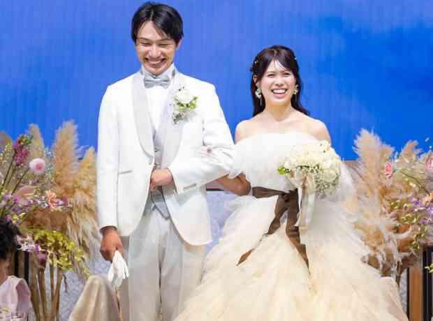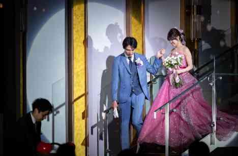 披露宴のクライマックスは、お二人の思い出の曲が流れる中でご新郎様からご新婦様へのサプライズ。花束に思いを乗せてバラの花束をお渡しになり、お互い歳をとっても一緒にいたいという気持ちを伝えていました。会場全体が温かい空気に包まれ、素敵なひとときに。お二人の歩むこれからの時間を象徴するようなシーンでした。