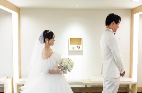 結婚式当日、支度を終えたお二人が初めて互いの姿を見せ合う「ファーストミート」。 振り返った瞬間に目に飛び込んでくるのは、これから夫婦になる相手が一番大切な日のために整えた特別な姿。 その光景を前に、お二人は緊張がふっと解けたように目を合わせ、自然と笑顔があふれていました。言葉にしなくても伝わるものがあるからこそ、ファーストミートはお二人にとっても見守るスタッフにとっても忘れられないひとコマに。