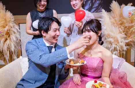 披露宴の後半には、ゲストの皆さまへのおもてなしとしてデザートビュッフェをご用意。色とりどりのスイーツが並ぶコーナーに自然と人が集まり、写真を撮ったり、席を移動して会話を楽しんだりと、会場全体がやわらかい笑顔で満たされました。 お二人もゲストの輪の中に入りながら一緒に時間を過ごされ、アットホームであたたかなひとときとなりました。