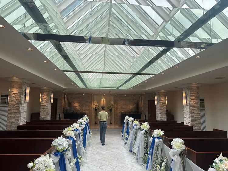 披露宴会場は窓ガラスをあえてつけていなく映像やライトアップでゲストを楽しませていた。 明るく素敵でした。