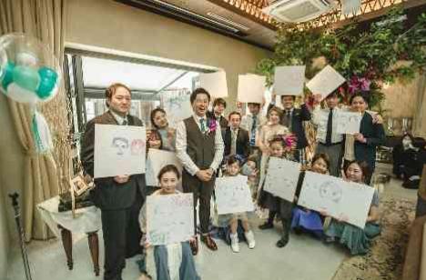 テーブル対抗でおふたりの似顔絵を描いていただきましたが、とってもかわいくて、素敵な似顔絵が仕上がってきました!!その似顔絵をみたおふたりは笑いが止まらず、、、おふたりがお気に入りの似顔絵を1枚セレクト。最後はおふたりの似顔絵に囲まれて記念撮影。みん名にご参加いただき、笑顔あふれる1日となりました!!
