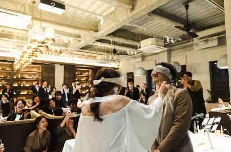 ケーキ入刀の後のファーストバイトはおふたりとも目隠しをし、ゲストの声で相手の口元までとどけるというスタイル。ゲストも一生懸命声を届けてくださり、何とか((笑))ケーキを届けることができました。笑いが絶えないとても楽しい時間。シンプルなイベントも大盛り上がり!! ゲストと一緒に盛り上がる最高の時間となりました!!