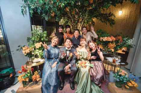 ウェディングパーティは、かしこまらず、私たちらしいにこだわった1日にしたかったおふたり。レストランに移動して、一気に熱気も高まります♪オレンジとグリーンのテーマカラーに囲まれた小物やお花のコーディネイト。おふたりのメインはゲストのみんなと写真をとれば、とっても素敵なフォトブースに。ドレスのカラーともリンクして思い描いた1日に。