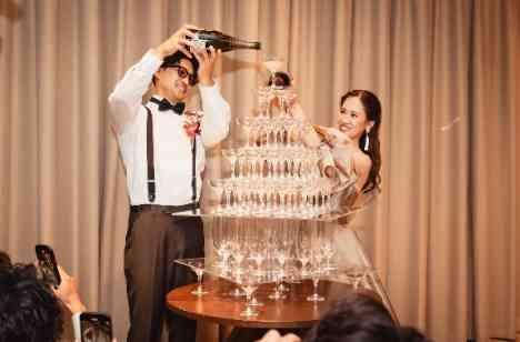 おふたりの憧れだったシャンパンタワー! シャンパンタワーには、感謝と幸せの象徴という意味が込められています。グラス一つ一つを積み上げるのは、一歩一歩人生を歩む、高く積み上げられたタワーには、天に感謝する。感謝の気持ちを込めて、おふたりが注ぐシャンパンタワーは華やかでもあり、おふたりとゲストのしあわせが満ち溢れるように。そんな想いを込めて。