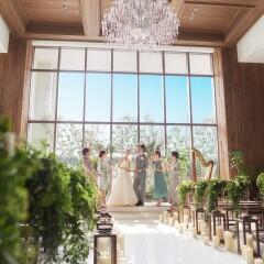 【感動の光と緑のチャペル体験♪】沢山の緑と太陽の光の溢れる人気のチャペルで感動の挙式体験を。天井高7mのチャペルの天井には大きな2つのシャンデリアがお二人の未来を祝福しています♪