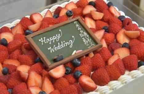 打合せの時からとても明るく楽しく準備を進めてくださっていたお二人! そんなお二人が携わっているご職業を取り入れたかわいいウェディングケーキをご用意。 いちごがたっぷり敷き詰められたかわいいケーキの中央には、黒板が・・・ 可愛い黒板には今日の日直が書かれています! このお写真を見てくださっている皆様もお二人のご職業が分かったはず。