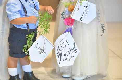 和やかな雰囲気で挙式がスタート 挙式の始まりを盛り上げてくれるのは、 『フラッグボーイくん&フラッグガールちゃん』でした! とっても素敵なフラッグにご注目ください! ゲストの皆様は沢山お写真を撮ってくださり、とても盛り上がる挙式のスタートとなりました。 可愛いお子様ゲストのお手伝いにより、新郎新婦様もリラックスして入場してくださいました!