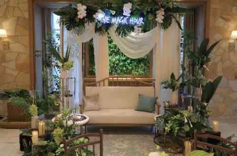 ブライダルフェアの時に「森のウェディング」にしたいとお話しくださったお2人。緑の装飾が沢山施された「ヴェルデカーサ」はお2人のイメージにぴったり。 さらにフラワーコーディネーターと南国系の葉っぱを取り入れたコーディネートを考案し、お2人の理想をかなえたメイン席が完成しました! ゲストと沢山素敵な写真が残せるようにとソファメインにされました。