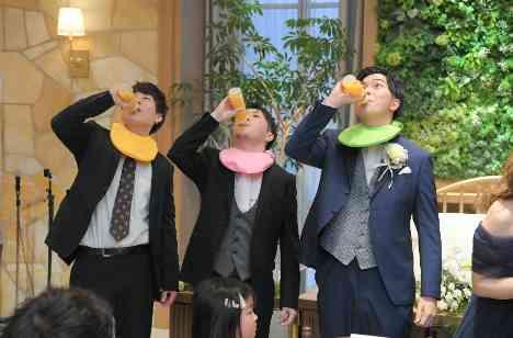 披露宴中盤には哺乳瓶を使って「オレンジジュースの早飲み対決」が行われました! 実は席札の裏に数字が書いてあり、早飲みの参加者はご新郎ご新婦の抽選で決定されるので、ゲストの皆様もドキドキ・・・ そして、早飲みに参加しないゲストも楽しめるように、「誰が早く飲み終わるか」を予想するゲームも同時に開催されました☆