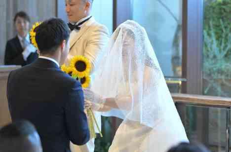 大切なゲストの方から新郎様新婦様の元へ1本ずつひまわりが届けられブーケが完成!1本1本異なる意味を持つ12本のひまわりが集まり、新郎様から新婦様へプレゼント・・・。ゲストの方も参加型の、よりギュッと距離が縮まるようなアットホームな演出により挙式が結ぶまでとてもあたたかな雰囲気が感じられるご挙式でした。