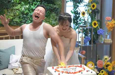 お笑いが大好きな新郎様。ジャケットを脱ぎタンクトップ姿でかっこくよくポージング!"筋肉"で有名なお笑い芸人を彷彿とさせる、明るく気合いの入った大きな掛け声で新婦様と元気にケーキご入刀!!!ご参加されているすべてのゲストの方がさらに笑顔と笑いが起こったお二人らしさたっぷりの大盛り上がりなシーンでした。