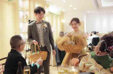 ドレス・タキシード当てクイズに正解したゲストの方には、なんとお二人からお菓子のプレゼントがございました。お菓子を受け取ったゲストの方はさらに笑顔に!ゲストの方との距離感がぐっと縮まる演出がたくさん詰まった心温かなご披露宴でした。お二人から直接おひとりおひとりに感謝を伝えることができ、会話ができるゲームで素敵でした・・・♡