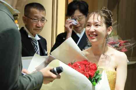 そして披露宴はRinaさんから親御様への手紙朗読と記念品贈呈のシーンへ。 親御様への感謝の気持ちもしっかりと伝えていただきめでたくお開き…かと思いきや、披露宴のフィナーレにはMikazeさんからRinaさんへのサプライズが!ご用意したのは赤いバラ99本のボリュームたっぷりな花束。Rinaさんの嬉しそうな笑顔と近くで温かく見守ってくださる親御様の表情がとても印象的なシーンとなりました。