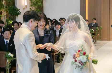 挙式本番、Chitoseさんはお母様にエスコートされながらご入場を。生まれる前も、生まれた瞬間も、一番近くにいてくださったお母様からYukiさんへエスコートがバトンタッチされる瞬間は、それぞれの想いが詰まった神聖なシーンです。そんな家族の絆が垣間見える瞬間を、ゲスト皆様も静かにあたたかく見守ってくださりました。