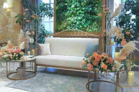 披露宴会場内のYukiさんとChitoseさんの高砂はソファ席に♪淡いオレンジ色のお花やパンパスグラスが華やかに会場を彩ります。ソファ席は新郎新婦様の全身の姿をゲストの方々に見ていただきやすく、新郎新婦様自身も動きやすいなどの利点が。また隔てるものがないため、ゲストの方々との距離もより近く感じることができ、ご歓談の時間も新郎新婦様を囲んでのフォトブースとして盛り上がることまちがいなしです…♡