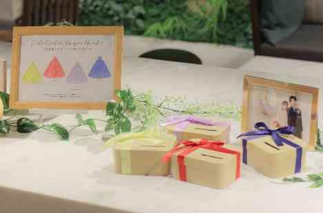 お色直しでは新郎新婦おふたりともガラッとお召し物を変えてご登場。カラードレスの色当てクイズも用意され、装い新たなMitsukiさんとSakiさんの姿が見えると、会場内も一気にボルテージがあがります。バイカラーのベージュのタキシードと赤いドレスがとてもお洒落でゲストからも「可愛い」と歓声があがった瞬間でした♡