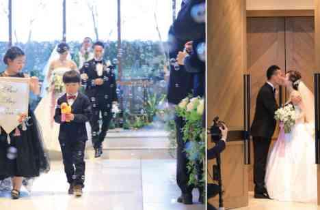 ご退場はフラッグガールとバブルボーイに先導され、 バブルシャワーのなか退場とみせかけて扉が閉まる瞬間のクロージングキス!! 皆様の記憶にばっちり残る最幸の演出です♡ 扉が閉まる瞬間まで、カメラのシャッター音と歓喜の声で大盛り上がりでした♪ おふたりも終始笑顔で、和やかで温かい式となりました。