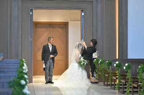 ベールダウンは親御様の子育ての卒業式と言われる 結婚式には欠かせないセレモニーの1つです。 お母さまに感謝の気持ちを伝えることで、 感動のシーンが演出されます。 そのあとは、今度はお父様とウエディングステップと呼ばれる歩き方でご新郎様のところまで歩みを進めていただきます。 そのあとはお父様から新郎様へバトンタッチをしていただきます。
