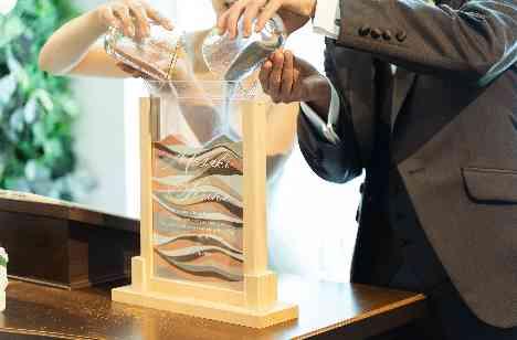 先程紹介した「とろろくん」が当日お手伝いをしてくれたのはたいせつな指輪をおふたりのもとまで運ぶ「リングドッグ」!ゲストからも思わず「可愛い~!!」という反応◎たいせつなご家族を交えての挙式がスタート。お打合せの際におふたりから出てきたご希望「ゲスト参加型の演出がしたい」そこで取り入れたのはサンドセレモニーでした!受付で皆様が入れてくださったものに挙式で結びにおふたりも入れて完成!!