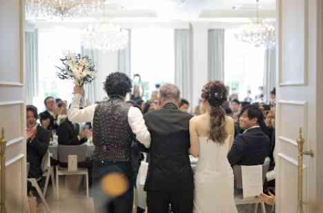お二人がお色直しの退場を一緒にエスコートされたのは新婦様のおじいさまでした。お色直しの退場のお時間になるとおふたりはおじいさまの席までお出迎えされずっとご結婚式を楽しみにされていたおじいさまにとってもお二人にとってもわすれることのできない素敵な思い出となりました!またお色直しの入場ではガーデンからサプライズで入場をされアットホームなお時間となりました!