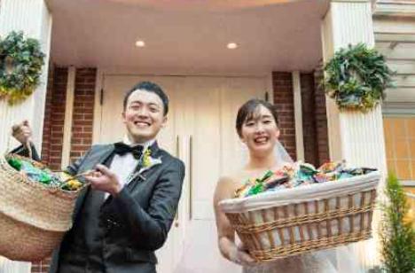 お子さまゲストも多かったおふたりは挙式が結んだあと独立チャペルの前で「お菓子まき」をされました。おふたりのお子さまも良く食べられている駄菓子や大人も楽しめるおつまみまで幅広くご用意されました。お子さまも大人のゲストの皆さまも楽しまれ、挙式の厳かな雰囲気から一転しわいわい盛り上がるシーンとなりました。