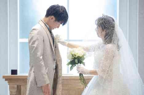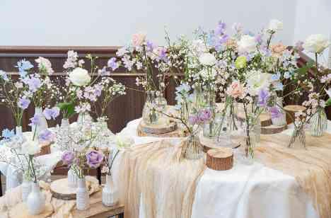 お付き合いが始まった桜が咲く春。あたたかな春の出会いにかけて指輪は「初桜」の名が付けられたものを選ばれておりましした。コンセプトにも「春」が入っているように結婚式当日もどこか春を感じられるようゲストテーブルのお花もアレンジしました。メインテーブルと同じお色味のお花にプラスして春っぽさを感じるピンクもあったり。ゲストの皆さまが小瓶を楽しそうに選ばれている姿が印象的でした。