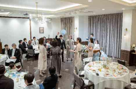 学生時代の休み時間ふうせんバレーボールをしていた新婦様。学生時代を思い出しながら披露宴のお時間にゲームとして実施しました。一分間でどれだけ多くトスできるかを競い合い、皆さまで大声でカウントしながらお楽しみいただきました。初めて挑戦されるゲストの皆さまも大盛り上がりでした。一番多かったグループにはおふたりからプレゼントもご用意され笑顔いっぱいの時間になりました。