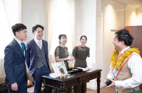 おふたりにお贈りしたコンセプトは-ハレ-。どんなことがあっても笑顔でいることを大切にされている新郎様とやまない雨はないからこそ物事を楽しく考えて過ごされてきた新婦様。お打ち合わせでもいつでも笑顔いっぱいのおふたり。「受付をお願いしているゲストが来たらサプライズで登場したい」と仰りお着替えの後ゲストの元へ。驚かれているゲストの様子が印象的でした。