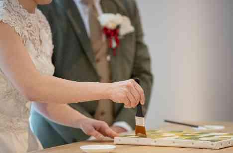 参加されるゲストと何か形に残るものを作りたい!と思いオリジナルキャンバスを作成されました!「結婚生活にたいせつなものは」をお題に色によって大切にしたいものが異なりふたりらしいキャンバスが仕上がりました。新郎様が選らばれたカーキのタキシードとキャンバスがリンクしていることも印象的でした。いつでもこのキャンバスを見返したら結婚式が思い返せるステキなアイテムになりました。