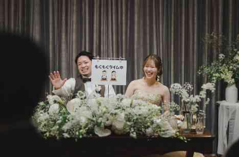 お打ち合わせの中で絶対にお肉は食べたい!!と仰られておりお色直し後「もぐもぐタイム」を設けられました。この時間は演出を入れずおふたりもお食事を楽しまれました。演出たくさんのおふたりであれば中々お料理を楽しむ時間が確保できないこともあり絶対召し上がられたいタイミングでは敢えてお食事タイムを設けることでお食事に没頭でき楽しんでいるおふたりの姿が印象的でした。