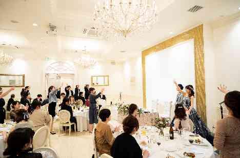 お色直しのご入場は会場を真っ暗にして、受付で取って頂いたサイリウムを皆様に振って頂きながらご入場をされました!その後はドレスの色と同じ「青色」のサイリウムをお持ちの方々にご起立頂き「じゃんけん大会!」 大盛り上がりの中、見事じゃんけんに勝ったゲストお一人様へプレゼントとお写真タイムをご用意されました♡