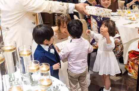 大切なご参列ゲストの中にはお子様が数名いらっしゃったおふたり。もちろん小さなゲストにもちゃんとご結婚式を楽しんで頂けるようにそれぞれにあったプレゼントをご用意をされました。おふたりの口からお名前をお呼びされ、お子様ゲストも大喜びで、前まで駆けつけてプレゼントを受け取る姿に会場全体「可愛い~!!」と大盛り上がりでした☆
