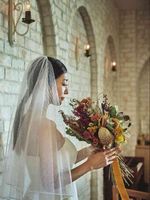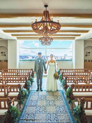 シャンデリアは木製、バージンロードはテラコッタ。レンガの壁に彩られた天然素材のナチュラルなチャペル。祭壇奥の空と相まって優しい空気間でふたりの誓いを祝福。