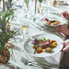 【国産牛やオマール海老試食】会場内のオープンキッチンから運ばれる料理は、ゲストも感動する美味しさ。五感で楽しめる全5品のハーフコースを無料で試食♪会場からの絶景と共にぜひ体験してみて♪