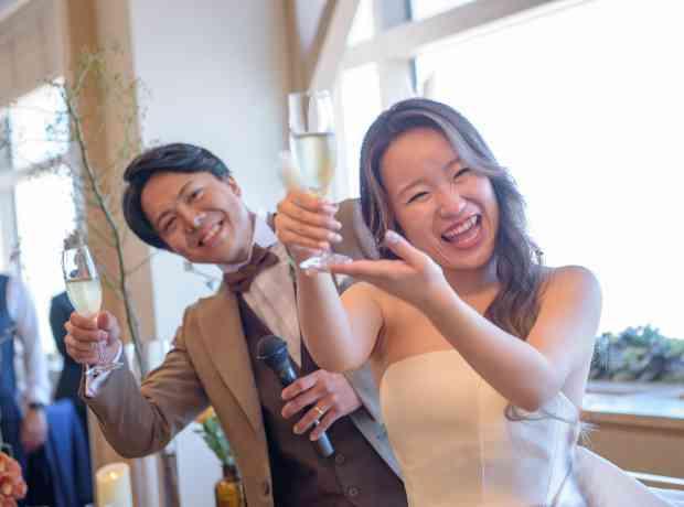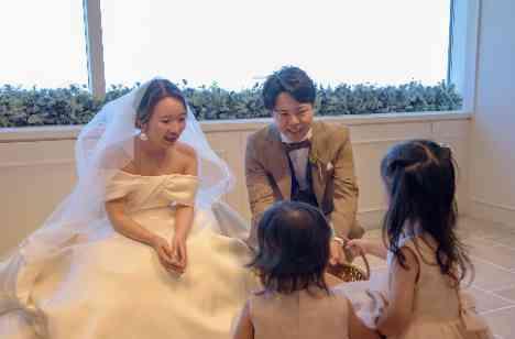 人前式では感謝を伝えつつ、カジュアルにしたいとご希望されていたお二人。挙式前には、ゲストの皆様に一斉にお二人のお手紙を読んでいただくスイッチングレターを行い、喜びの歓声が聞こえました。式では、サプライズでご友人様を呼び出し、牧師役をお願いしました。驚きながらも盛大に盛り上げてくださいました。お二人のお子様には、リングガール務めてもらい、あまりの可愛さに会場中が和やかな雰囲気になりました。