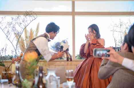 一つ目のサプライズは、ご新婦様のヘアカットでした。ゲストの皆様へサプライズで、お色直し中に新婦様のヘアカットを行い、ご新郎様へもセカンドミートを行い、ワクワクの再入場となり、ゲストの皆様もとても驚いていらっしゃいました。 二つ目のサプライズは、ご新郎様からご新婦様へ、ご新婦様の憧れである、ひまわりの花束のプレゼントがありました。ご新婦は驚きと喜びで涙され、会場が感動で包まれました。