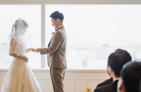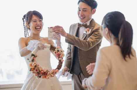 人前式では、ゲストの皆様に「承認の拍手」の代わりとして、サプライズでラムネ笛を吹いていただきました。 実はこの笛、リングボックスの中に仕込まれていた特別なアイテム。合図とともに一斉に吹かれると、会場中にきれいな音色が響きわたり、思わず笑顔がこぼれる温かな瞬間となりました。 “人とは少し違うことをしたい”“楽しいことを取り入れたい”というおふたりの想いが形になった、セレモニーシーンでした。