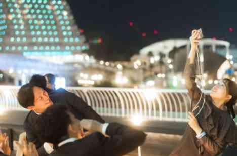 会場内は真っ暗でまるでライブが始まる様! おふたりのオープニングムービーが上映スタート。 ペンライトを光らせて、会場内の温度は最高潮!再入場はなんとテラスから! 巨大クラッカーを持って登場し、迫力のある演出に大盛り上がり! ここから後半戦スタートです! ご友人からは音楽の余興が。おふたりも参加し実際にライブ♪ テーマとバッチリな進行でゲストの皆様とともにスタッフまで楽しみました。